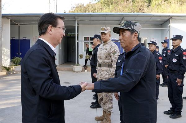 12月25日,王宁在瑞丽畹町镇新合村边境联防所,详细了解边境立体化防控情况,慰问党政军警民强边固防干部群众代表,与全国优秀界务员李洪刚等握手交谈。