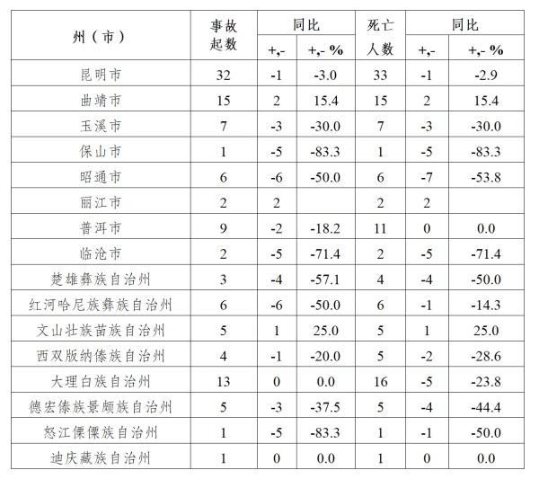 1月至2月,全省发生各类生产安全事故115起、死亡122人,同比分别减少34起、34人,下降22.8%、21.8%。其中,较大事故1起、死亡3人,同比分别减少2起、11人,下降66.7%、78.6%;未接报重大及以上事故。