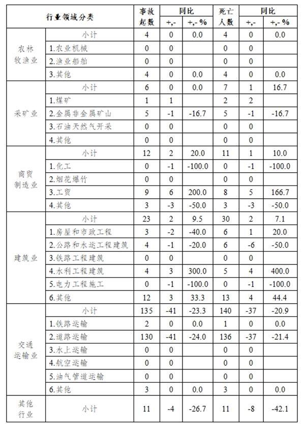 扣除道路运输事故,其他行业领域共发生事故61起、同比持平,死亡67人、同比减少4人、下降5.6%。其中,较大事故2起、同比持平,死亡6人、同比减少5人、下降45.5%。