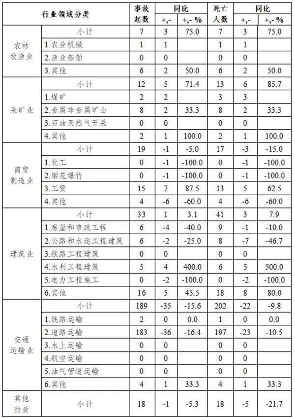 较大事故:道路运输事故2起、死亡6人,同比均持平;房屋和市政工程事故1起、死亡3人,同比分别净增加1起、3人;公路和水运工程建筑事故1起、同比持平,死亡3人、同比减少5人。