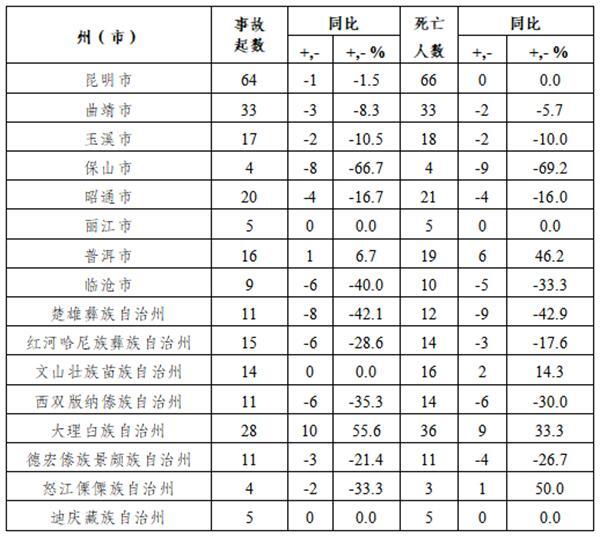 较大事故:大理州2起、同比增加1起,死亡6人、同比减少2人;文山州1起、死亡3人,同比分别净增加1起、3人;西双版纳州1起、死亡3人,同比均持平。