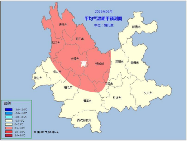 (二)气温。全省大部地区接近常年同期到偏高,其中迪庆州、怒江州、丽江市、大理州、楚雄州、玉溪市西北部、普洱市北部、临沧市东部、保山市东部偏高0.5°C~1.0°C(图2)。