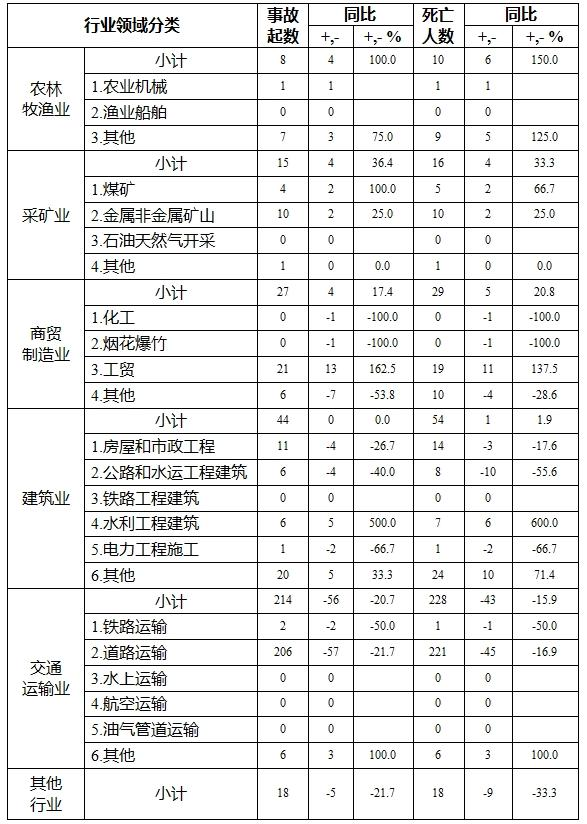 较大事故:道路运输事故2起、死亡6人,同比均持平;房屋和市政工程事故1起、死亡3人,同比净增加1起、3人;公路和水运工程建筑事故1起、同比持平,死亡3人、同比减少5人;商贸制造业其他事故1起、死亡5人,同比净增加1起、5人;农林牧渔业其他事故1起、死亡3人,同比净增加1起、3人。