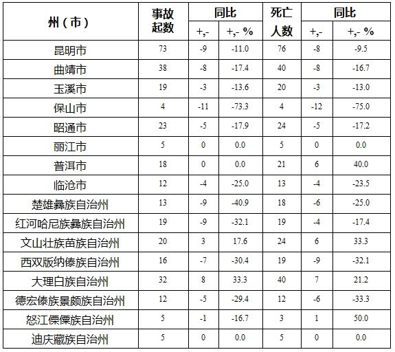 较大事故:大理州2起、同比增加1起,死亡6人、同比减少2人;楚雄州1起、死亡5人,同比净增加1起、5人;文山州1起、死亡3人,同比净增加1起、3人;曲靖市1起、死亡3人,同比净增加1起、3人;西双版纳州1起、死亡3人,同比减少1起、3人。