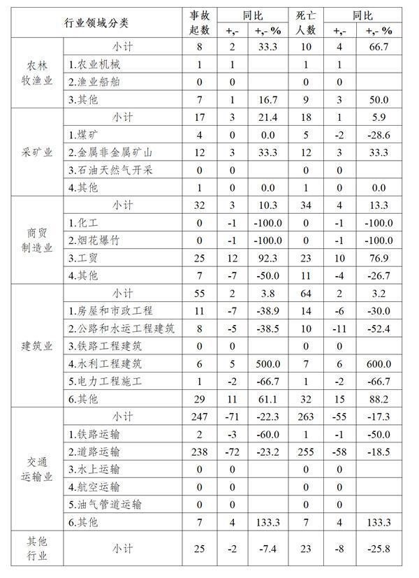 较大事故:道路运输事故2起、死亡6人,同比分别减少1起、3人;房屋和市政工程事故1起、死亡3人,同比均持平;公路和水运工程建筑事故1起、同比持平,死亡3人、同比减少5人;农林牧渔业其他事故1起、死亡3人,同比分别净增加1起、3人;商贸制造业其他事故1起、死亡5人,同比分别净增加1起、5人。