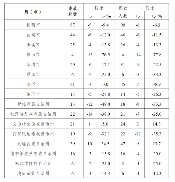 较大事故:大理州2起、同比增加1起,死亡6人、同比减少2人;曲靖市1起、死亡3人,同比分别净增加1起、3人;楚雄州1起、死亡5人,同比分别净增加1起、5人;文山州1起、死亡3人,同比分别净增加1起、3人;西双版纳州1起、死亡3人,同比分别减少1起、3人。