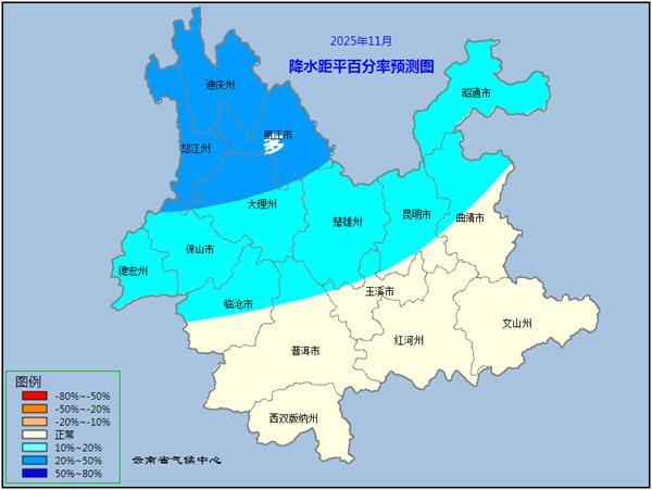 (一)降水。迪庆州、怒江州、丽江市、大理州北部偏多20%~50%,大理州南部、保山市、德宏州、临沧市北部、普洱市北部、楚雄州、昆明市北部和中部、曲靖市北部、昭通市偏多10%~20%,其余地区接近常年同期(图1)。