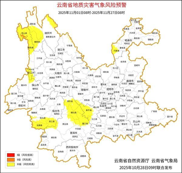 (三)地质灾害风险。11月份,随着降水减少,全省地质灾害活动水平减弱,地质灾害风险降低,但局地存在短时强降水、冰雪冻融、昼夜温差加大导致地质灾害发生的可能。需重点关注怒江州大部、迪庆州西部北部、昭通市南部、普洱市北部、玉溪市西部、临沧市南部等地区(图3)。应持续重点防范公路、铁路、水利水电建设以及矿山开采等工程建设活动引发的地质灾害。建议:全面排查并严密防范工程建设、生产经营等领域的地质灾害风险,重点强化高陡边坡、深挖填方等关键区域的动态管控,确保风险隐患早发现、早处置。加强滇东北、滇西北地区气温、雨雪等气象要素监测,深化数据综合分析研判,同时做好冻融期巡查排查,严防次生灾害发生。