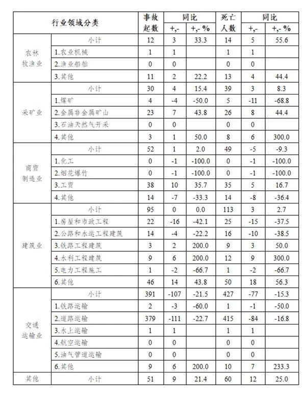 较大事故:交通运输业中道路运输事故5起、死亡18人,同比减少1起、2人;建筑业事故4起、死亡16人,同比增加1起、减少1人,其中,房屋和市政工程事故1起、死亡3人,公路和水运工程建筑事故1起、死亡3人,铁路工程建筑事故1起、死亡7人,水利工程建筑事故1起、死亡3人;采矿业事故3起、死亡12人,同比增加1起、3人,其中,金属非金属矿山事故1起、死亡5人,其他事故2起、死亡7人;农林牧渔业其他事故1起、死亡3人,同比净增加1起、3人;其他行业事故2起、死亡12人,事故起数同比持平、死亡人数同比增加6人。