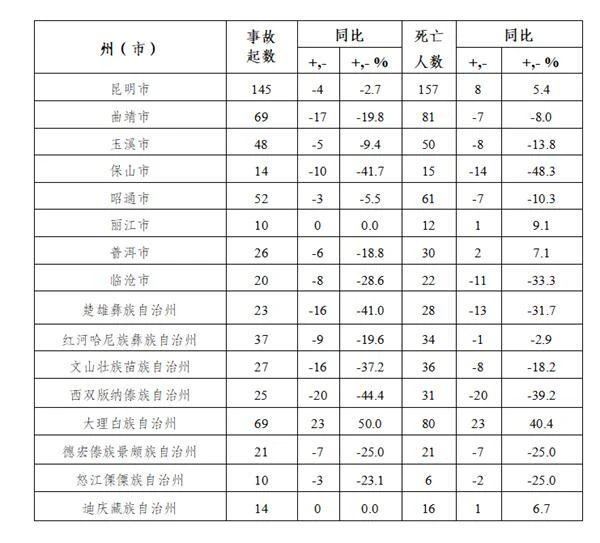 较大事故:曲靖市3起、死亡13人,同比净增加3起、13人;文山州3起、死亡10人,同比净增加3起、10人;大理州3起、死亡9人,同比增加2起、1人;昆明市1起、死亡8人,同比减少1起、增加2人;昭通市1起、死亡7人,同比减少3起、8人;丽江市1起、死亡3人,同比净增加1起、3人;楚雄州1起、死亡5人,同比净增加1起、5人;西双版纳州1起、死亡3人,同比减少1起、3人;迪庆州1起、死亡3人,同比净增加1起、3人。
