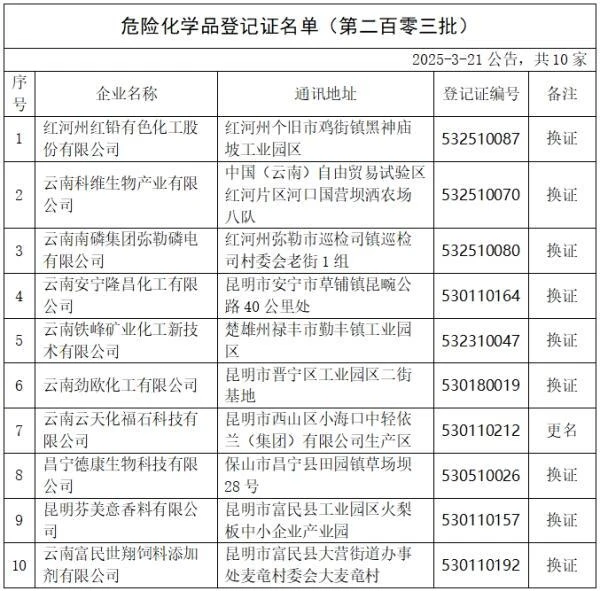 根据《危险化学品安全管理条例》《危险化学品登记管理办法》有关规定,经云南省危险化学品登记中心初审、应急管理部化学品登记中心复审合格,下列危险化学品生产、进口单位(共10家)取得《危险化学品登记证》,现予以公告。