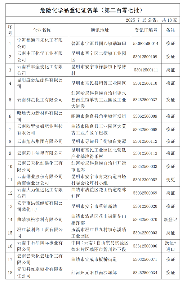 根据《危险化学品安全管理条例》《危险化学品登记管理办法》有关规定,经云南省危险化学品登记中心初审、应急管理部化学品登记中心复审合格,下列危险化学品生产、进口单位(共18家)取得《危险化学品登记证》,现予以公告。