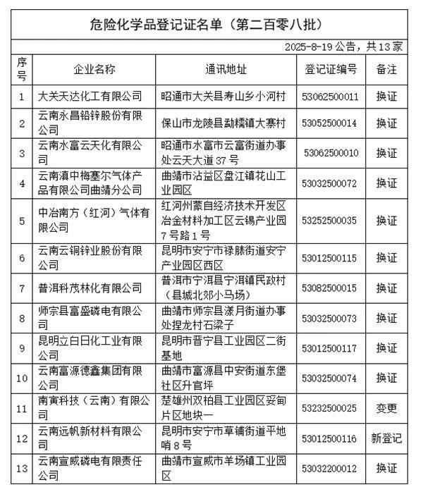 根据《危险化学品安全管理条例》《危险化学品登记管理办法》有关规定,经云南省危险化学品登记中心初审、应急管理部化学品登记中心复审合格,下列危险化学品生产、进口单位(共13家)取得《危险化学品登记证》,现予以公告。