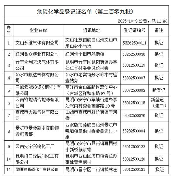 根据《危险化学品安全管理条例》《危险化学品登记管理办法》有关规定,经云南省危险化学品登记中心初审、应急管理部化学品登记中心复审合格,下列危险化学品生产、进口单位(共11家)取得《危险化学品登记证》,现予以公告。