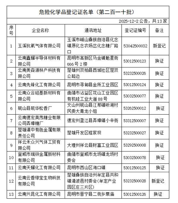 根据《危险化学品安全管理条例》《危险化学品登记管理办法》有关规定,经云南省危险化学品登记中心初审、应急管理部化学品登记中心复审合格,下列危险化学品生产、进口单位(共13家)取得《危险化学品登记证》,现予以公告。