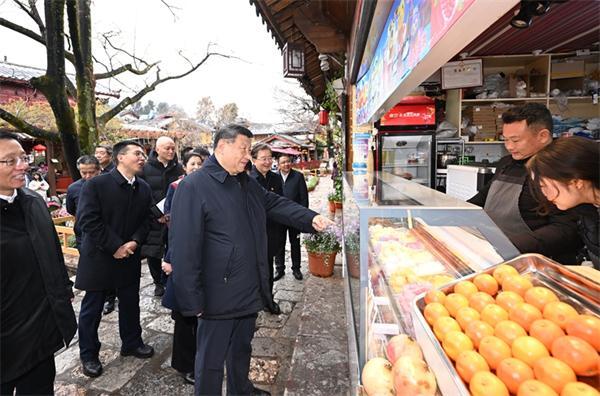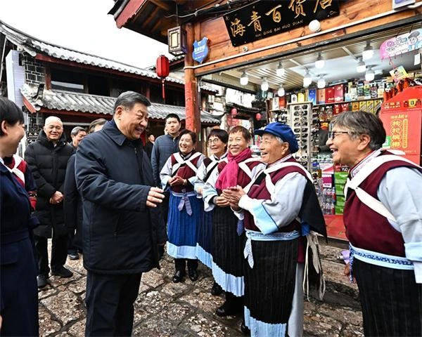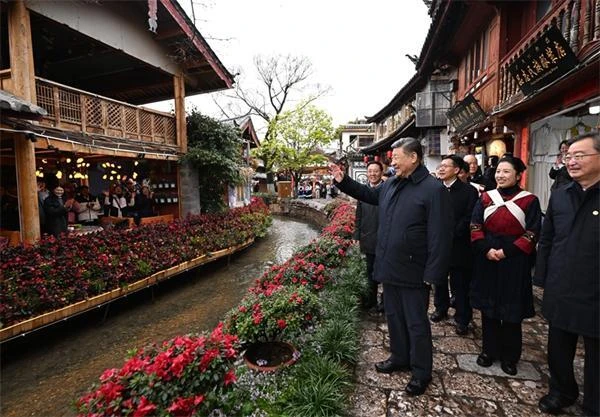 丽江古城有800多年历史,被列入世界文化遗产名录。一场春雪过后,丽江游人如织。习近平来到这里,详细了解古城营建历史、纳西族民居特色和当地文化遗产保护利用、推动文旅融合发展等情况。居民和游客见到总书记十分兴奋,争相问好,有的还弹奏乐器、载歌载舞欢迎总书记。习近平频频与大家互动交流,了解商铺经营状况和游客感受。他要求当地处理好保护和发展的关系,让这座美丽的古城焕发新的光彩。