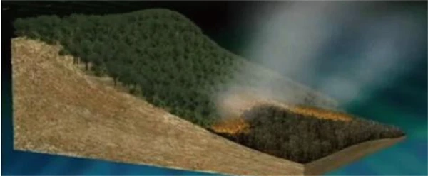 2.可燃物垂直连续分布的植被。林火在此类植被燃烧可迅速蔓延到树冠,形成立体燃烧的树冠火,如遇大风天气,极易产生“飞火”和“火旋风”,导致火势突变,易造成人员伤亡。
