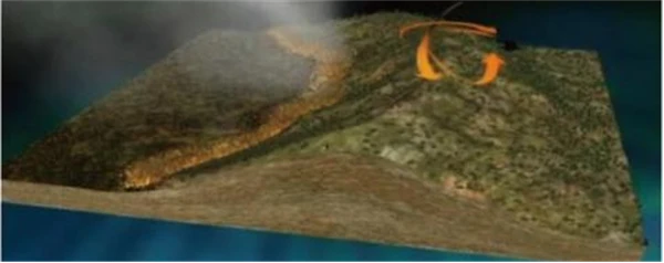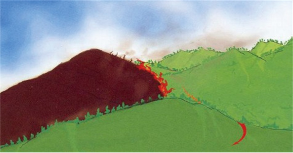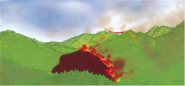 2.山脊。由于林火使空气升温沿山坡上升到山顶,与背风坡吹来的冷空气相遇,从而形成飘忽不定的阵风和空气乱流运动,使林火行为瞬息万变,难以预测(图1-2)。