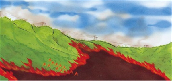 2.冲越火线避险。在遭遇特别紧急险情,没有时间和条件采取其他避险方法突围时,宜强行冲越火线进入火烧迹地避险。冲越火线时应选择火势较弱、地形相对平坦的部位,尽可能集中力量降低火势,穿好防护服装,用湿毛巾捂住口鼻,抛弃易燃易爆及重装备,以最快速度强行冲越火线进入火烧迹地避险。进入火烧迹地后,要防止余火烫伤和烟害(图1-14)。
