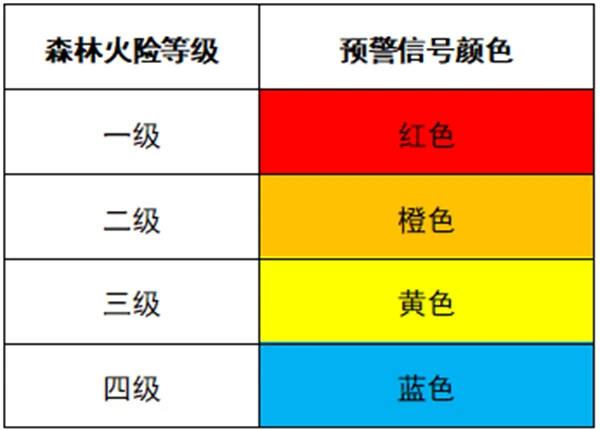 国家建立森林草原火险分级预警制度,按照森林草原火险的紧急程度、发展势态和可能造成的危害程度分为一级、二级、三级和四级,分别用红色、橙色、黄色和蓝色标示,一级为最高级别。