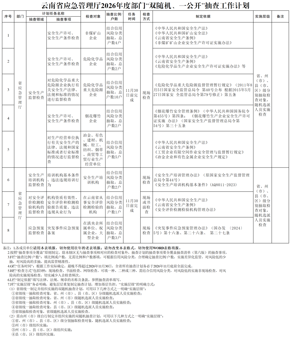 云南省应急管理厅2026年度部门“双随机、一公开”抽查工作计划