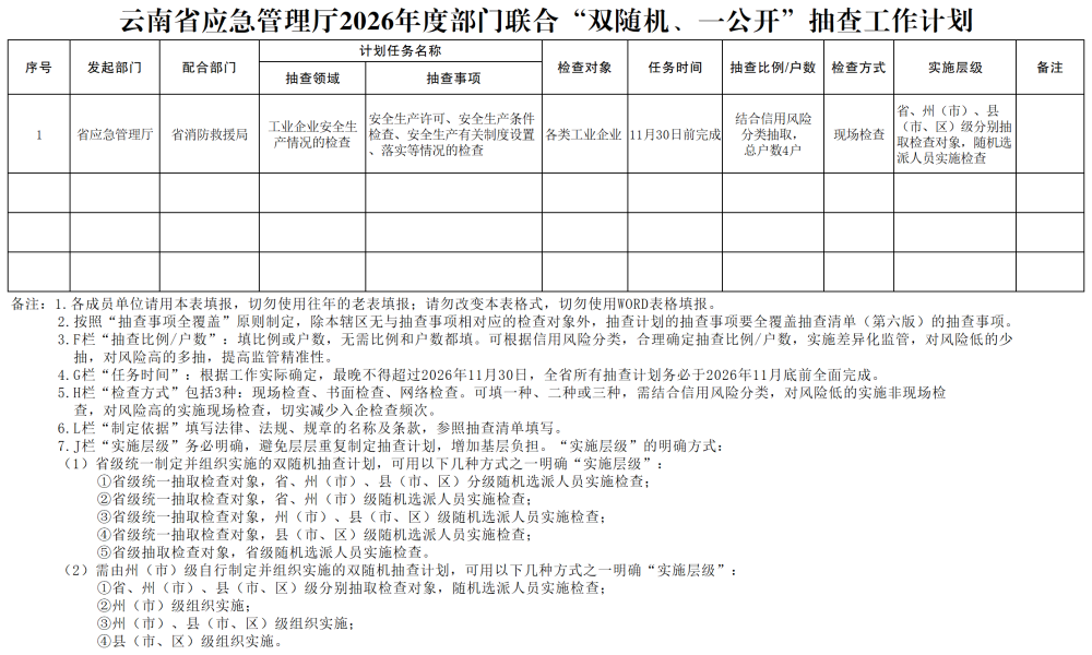 云南省应急管理厅2026年度部门联合“双随机、一公开”抽查工作计划