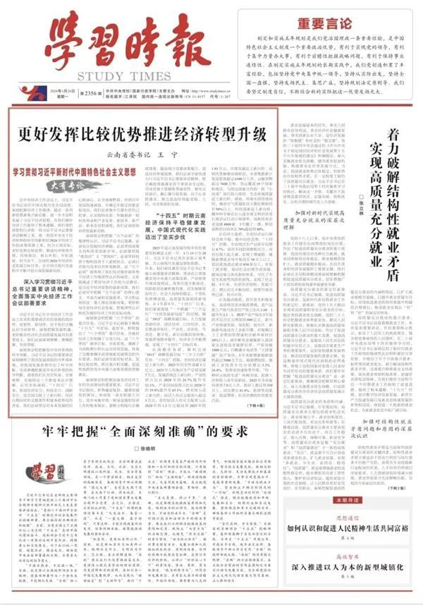1月26日,《学习时报》头版头条刊发云南省委书记王宁署名文章《更好发挥比较优势推进经济转型升级》。