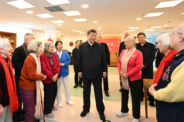 2月9日至10日,中共中央总书记、国家主席、中央军委主席习近平在北京考察并看望慰问基层干部群众。这是10日上午,习近平在西城区“吾老·新街”养老服务街区银龄老年公寓考察时,同老人们亲切交流。新华社记者 谢环驰 摄