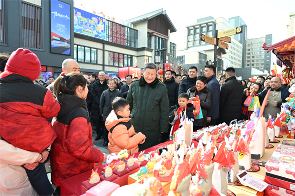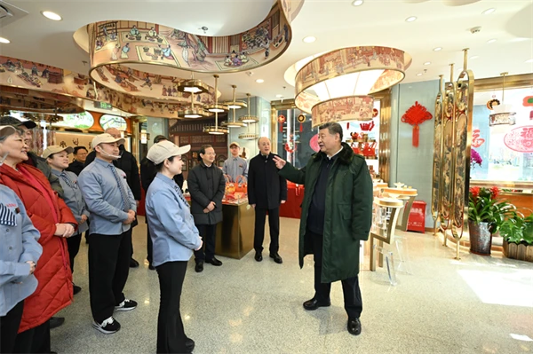 正值农历小年,隆福大厦前,新春市集吸引了大量市民和游客。习近平饶有兴致察看各式年货摊位,同现场群众亲切交流。他愉快地向大家讲起年少时多次到隆福寺的情景,还购买了几份特色食品和文创产品。