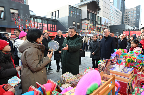 2月9日至10日,中共中央总书记、国家主席、中央军委主席习近平在北京考察并看望慰问基层干部群众。这是10日上午,习近平在东城区隆福寺街区新春市集考察时,同现场群众亲切交流。新华社记者 燕雁 摄