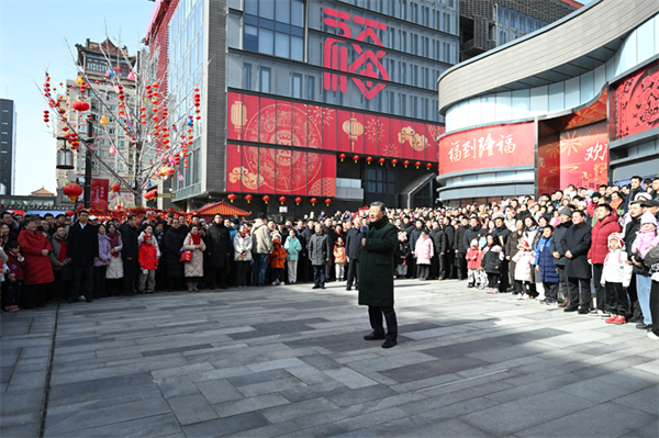 2月9日至10日,中共中央总书记、国家主席、中央军委主席习近平在北京考察并看望慰问基层干部群众。这是10日上午,习近平在东城区隆福寺街区考察时,向全国各族人民和香港同胞、澳门同胞、台湾同胞、海外侨胞致以美好的新春祝福。新华社记者 谢环驰 摄